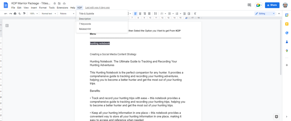 This service provides a pre-made DOC file with GPT prompt integrated. you can use it to generate ideas, titles, descriptions, keywords ...for your Books